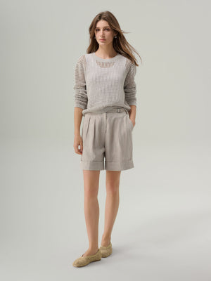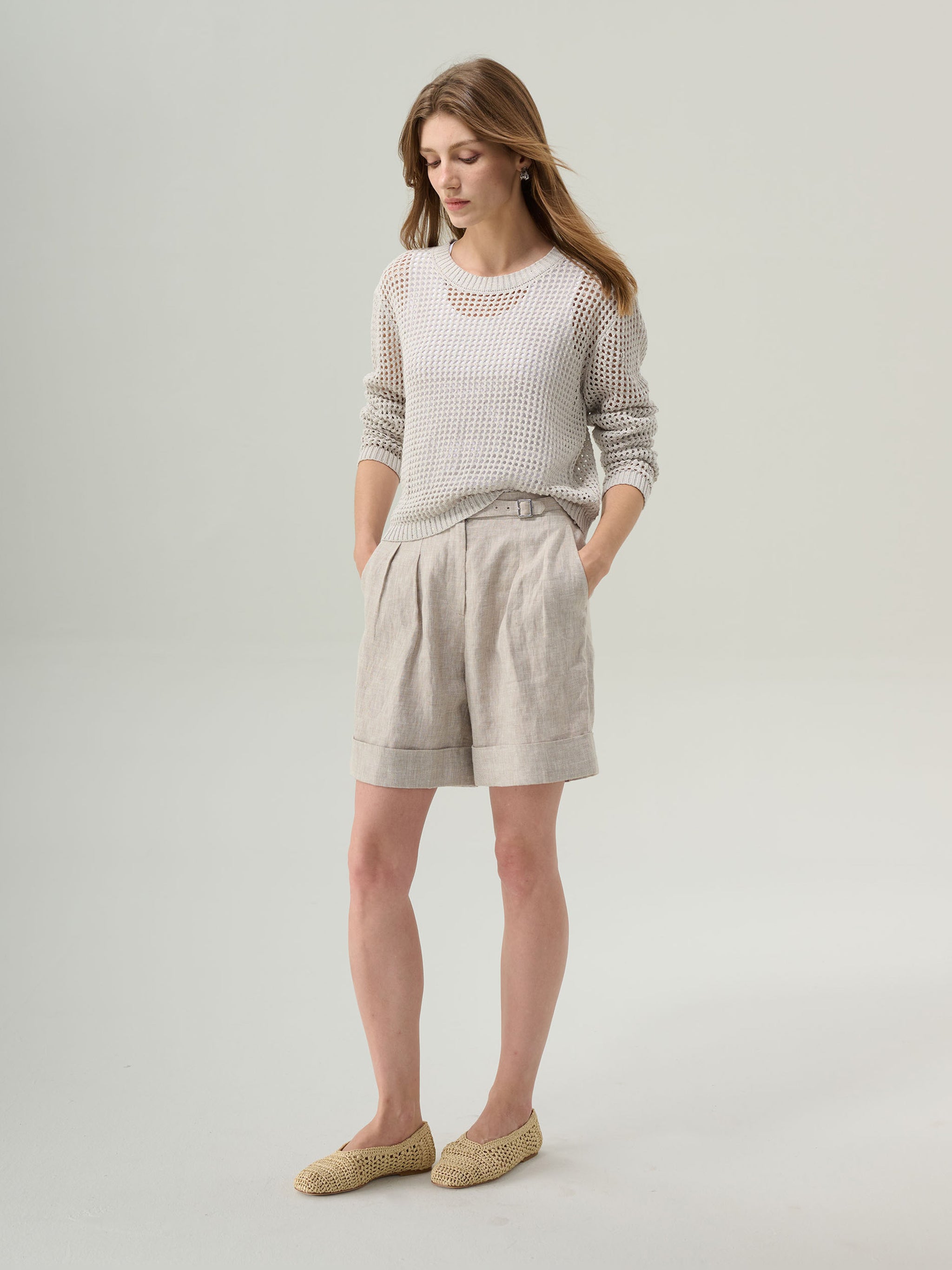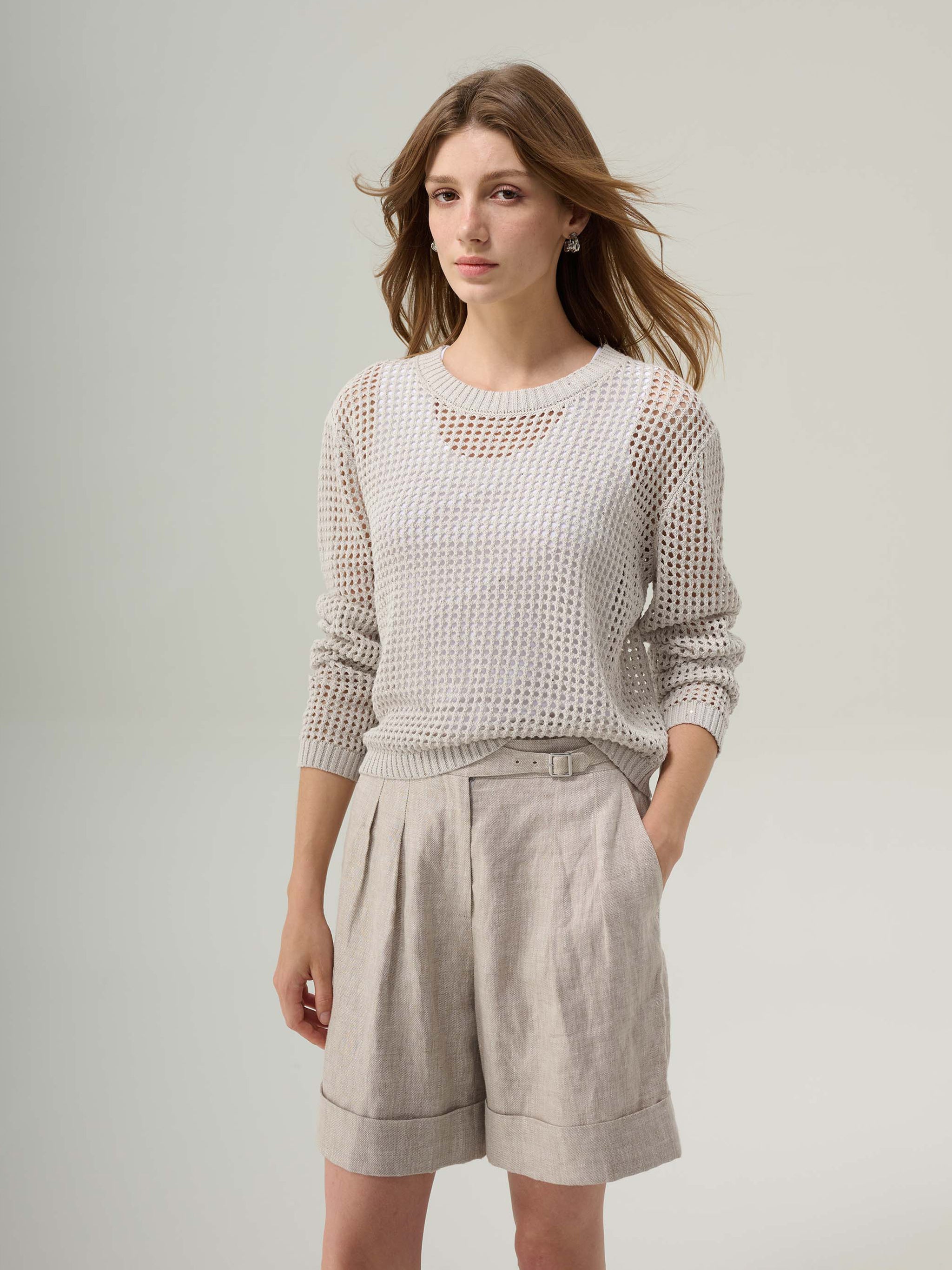 Woven from a breathable blend of cotton and hemp, this jacquard knit offers understated elegance with unexpected detail. Crafted on a precision STOLL machine, its openwork pattern creates a light, airy feel.