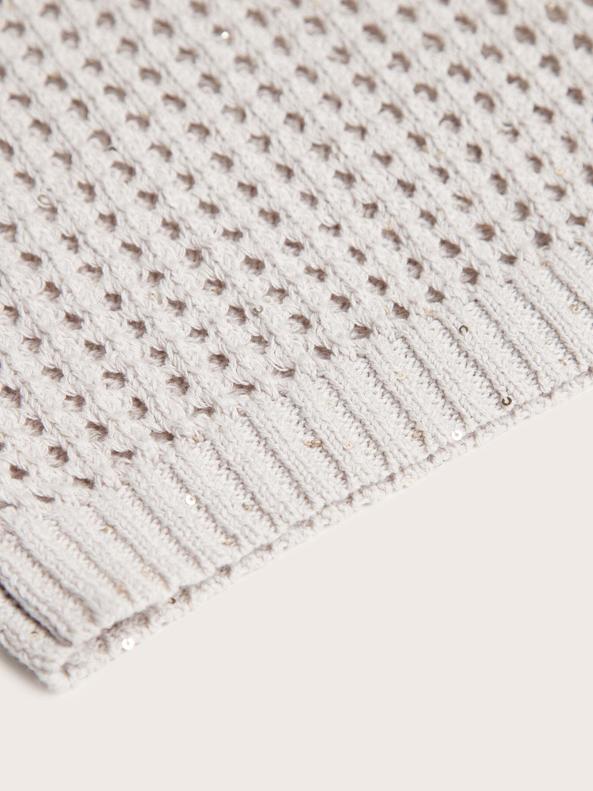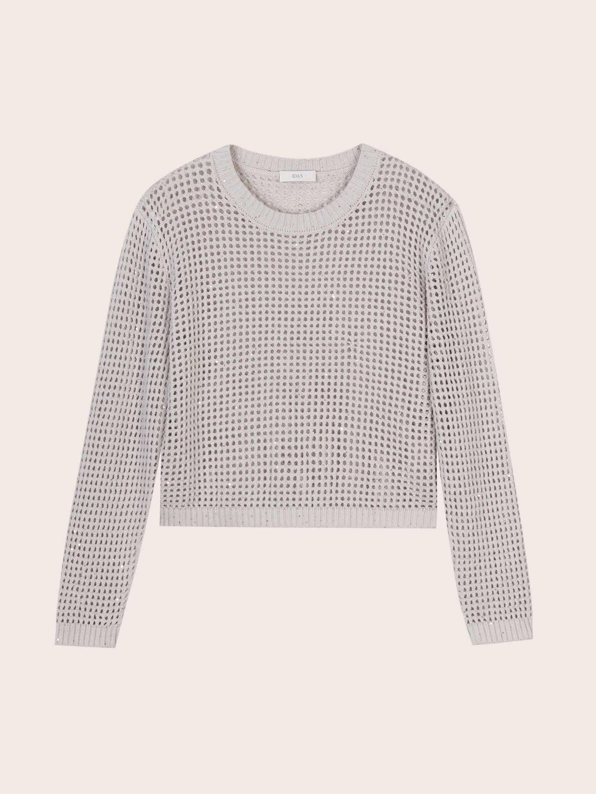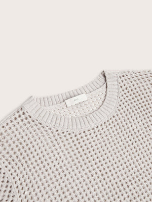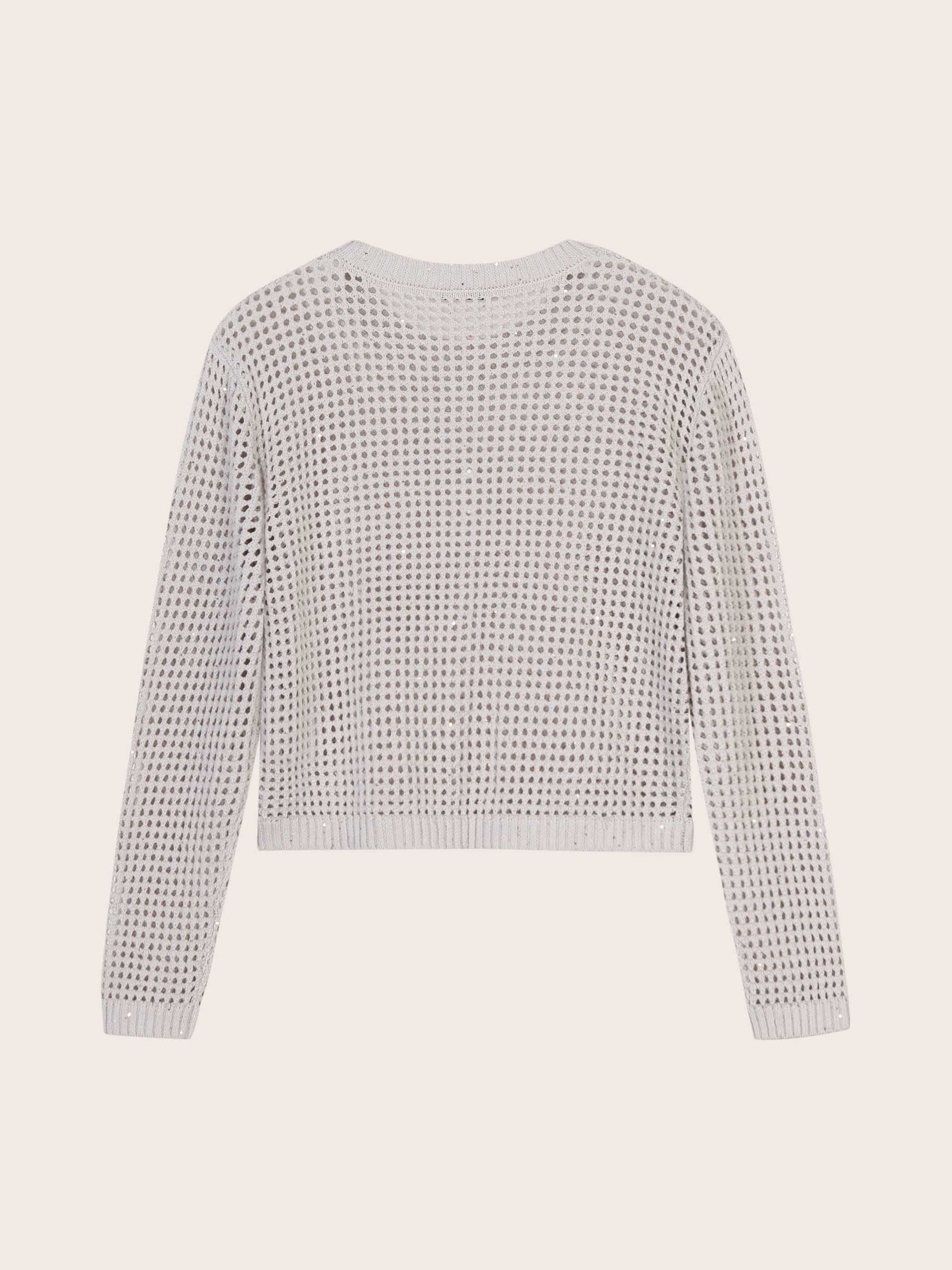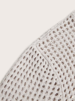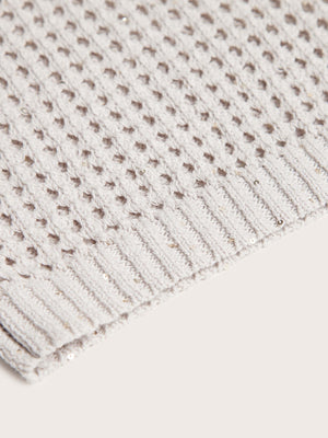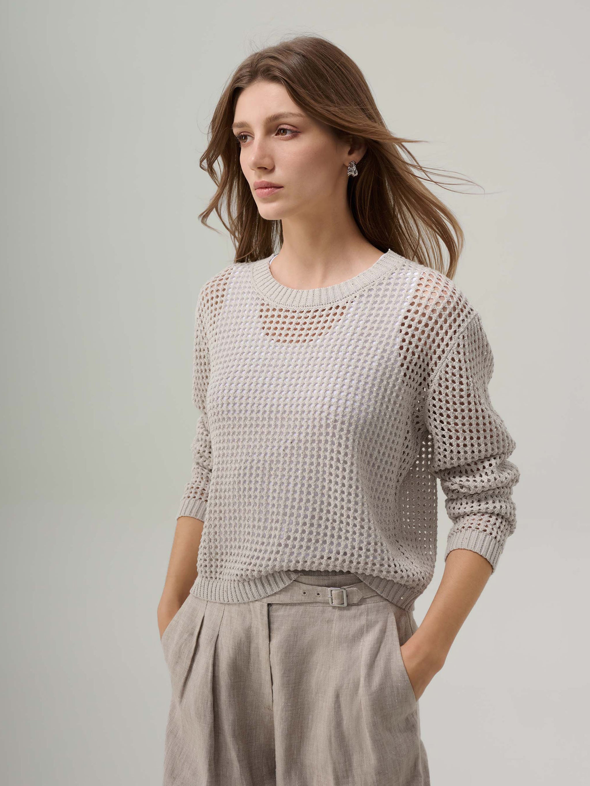 The Maeve Knit Sweater is a lightweight, open-knit pullover designed for effortless layering. Crafted from soft cotton-hemp yarn, it features an airy, perforated texture with subtle sequin detailing woven throughout for a hint of shimmer. The relaxed silhouette includes a classic crew neckline, long sleeves, and ribbed trim at the collar, cuffs, and hem for shape retention. Style it over tanks, bralettes, or dresses for a breathable yet elevated look.