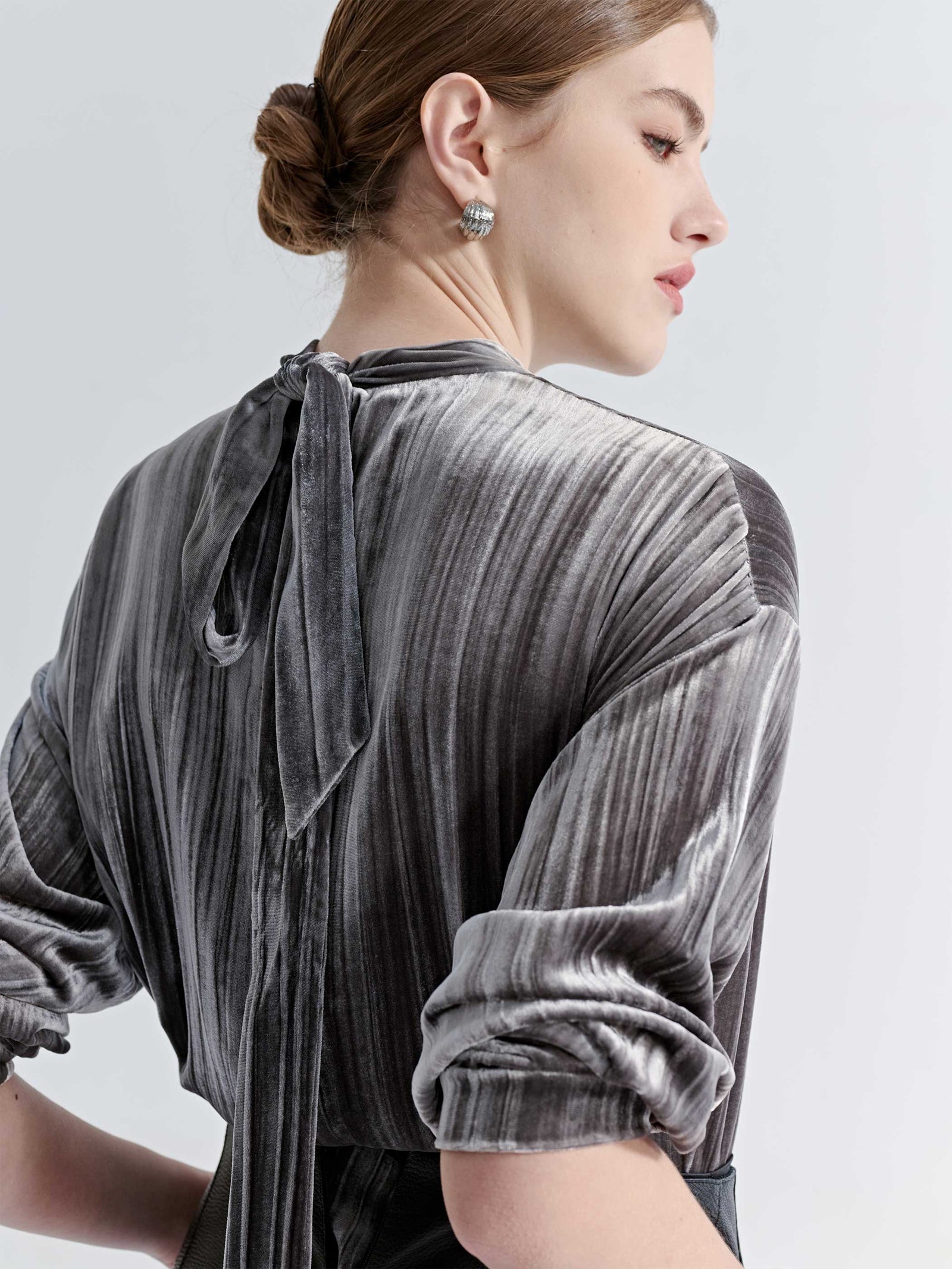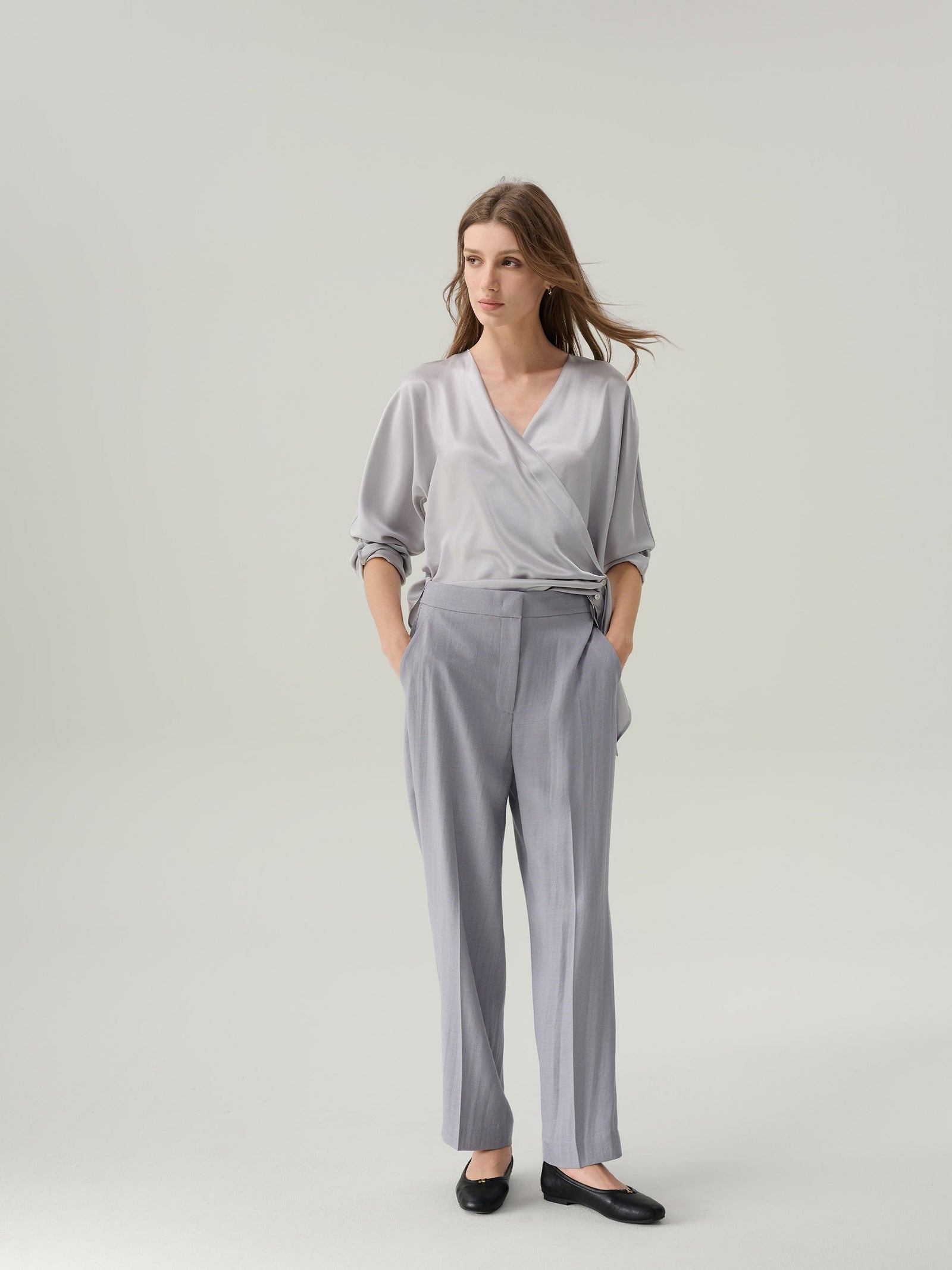 A blouse offers a softer approach, designed with fluidity in mind. Subtle pleats, gentle draping, and delicate fastenings create a more effortless silhouette, ideal for ease of movement. A wool-blend design with subtle pleats balances structure and movement, shifting easily between work, weekend, and everything in-between.
