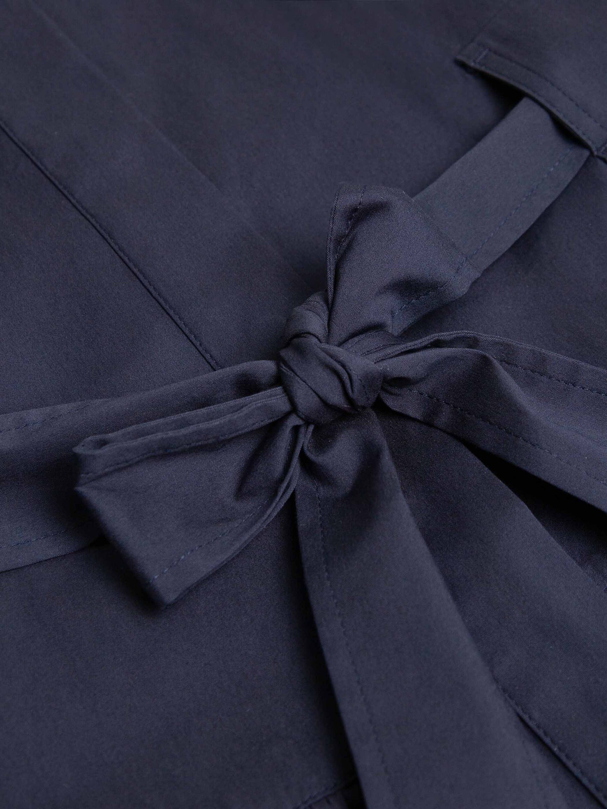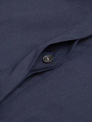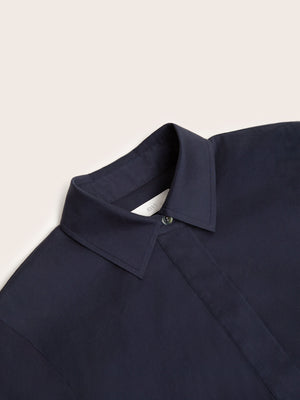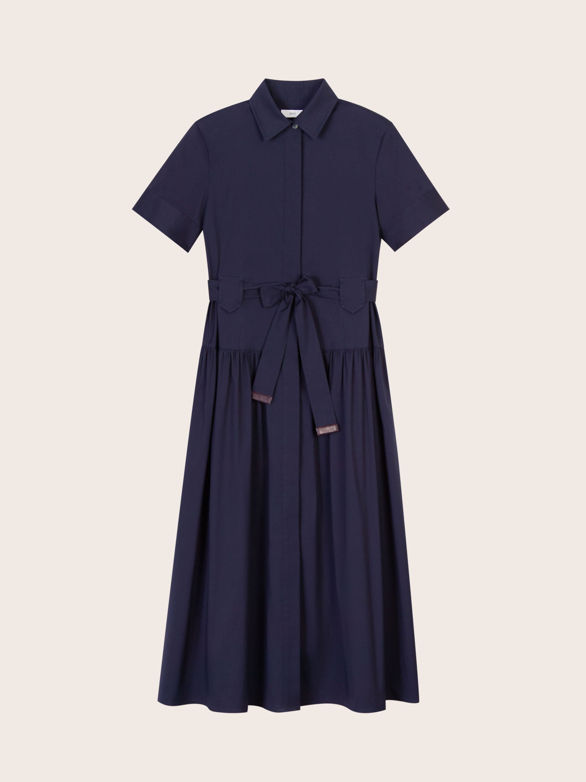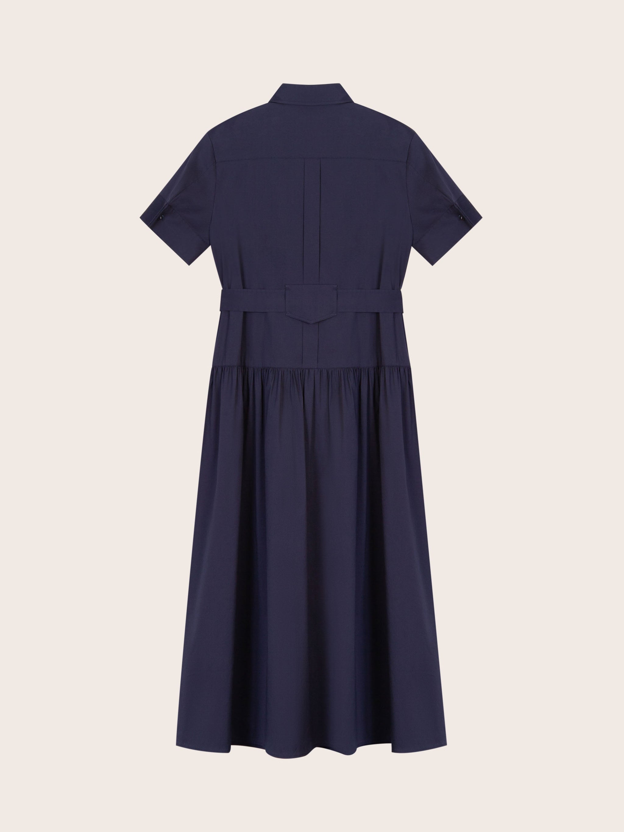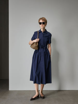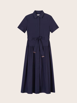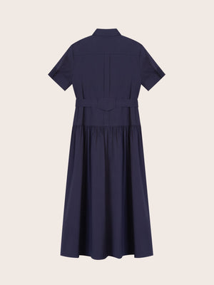Effortlessly refined, the Chloe Navy Midi Dress is crafted from a smooth cotton blend for a lightweight yet structured feel. The shirt dress silhouette features a pointed collar, short sleeves with button tabs, and a concealed button placket for a clean finish. A detachable self-tie belt with leather-tipped ends defines the waist, while gathered detailing through the skirt adds soft volume.