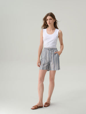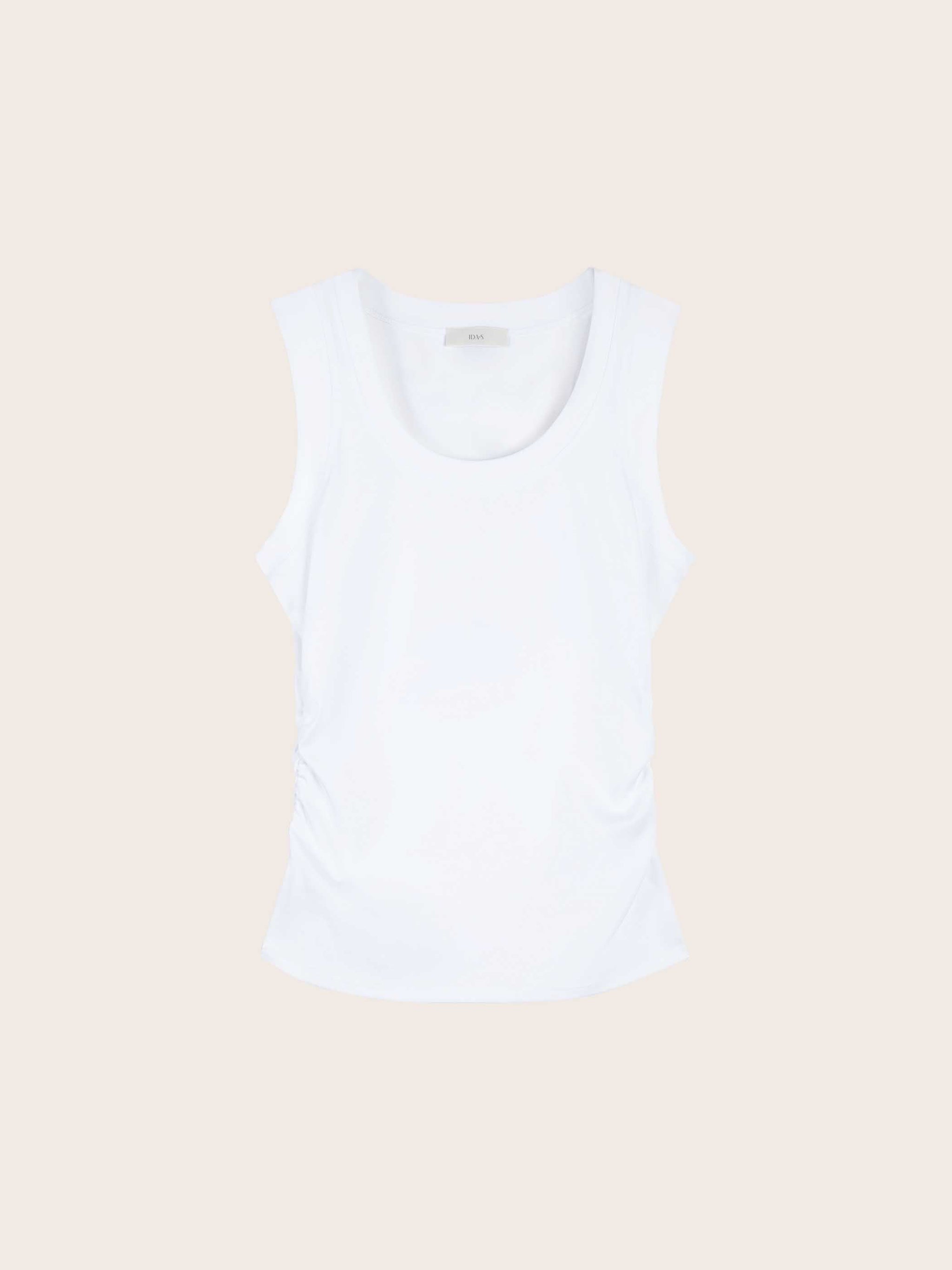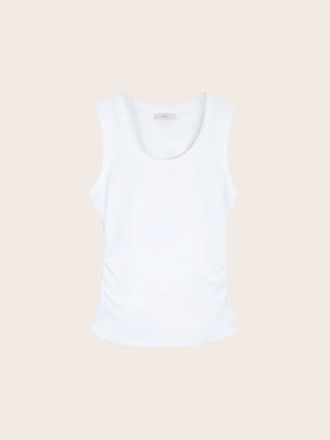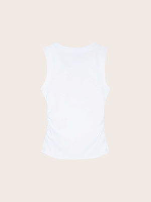 The Mae White Tank Top is a timeless essential designed for everyday versatility. Made from a soft, stretchy cotton blend, it offers a smooth, body-skimming fit with subtle side ruching for a flattering touch. Its clean scoop neckline and crisp white finish make it perfect for layering or wearing on its own.