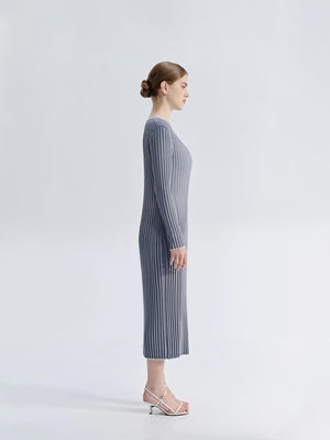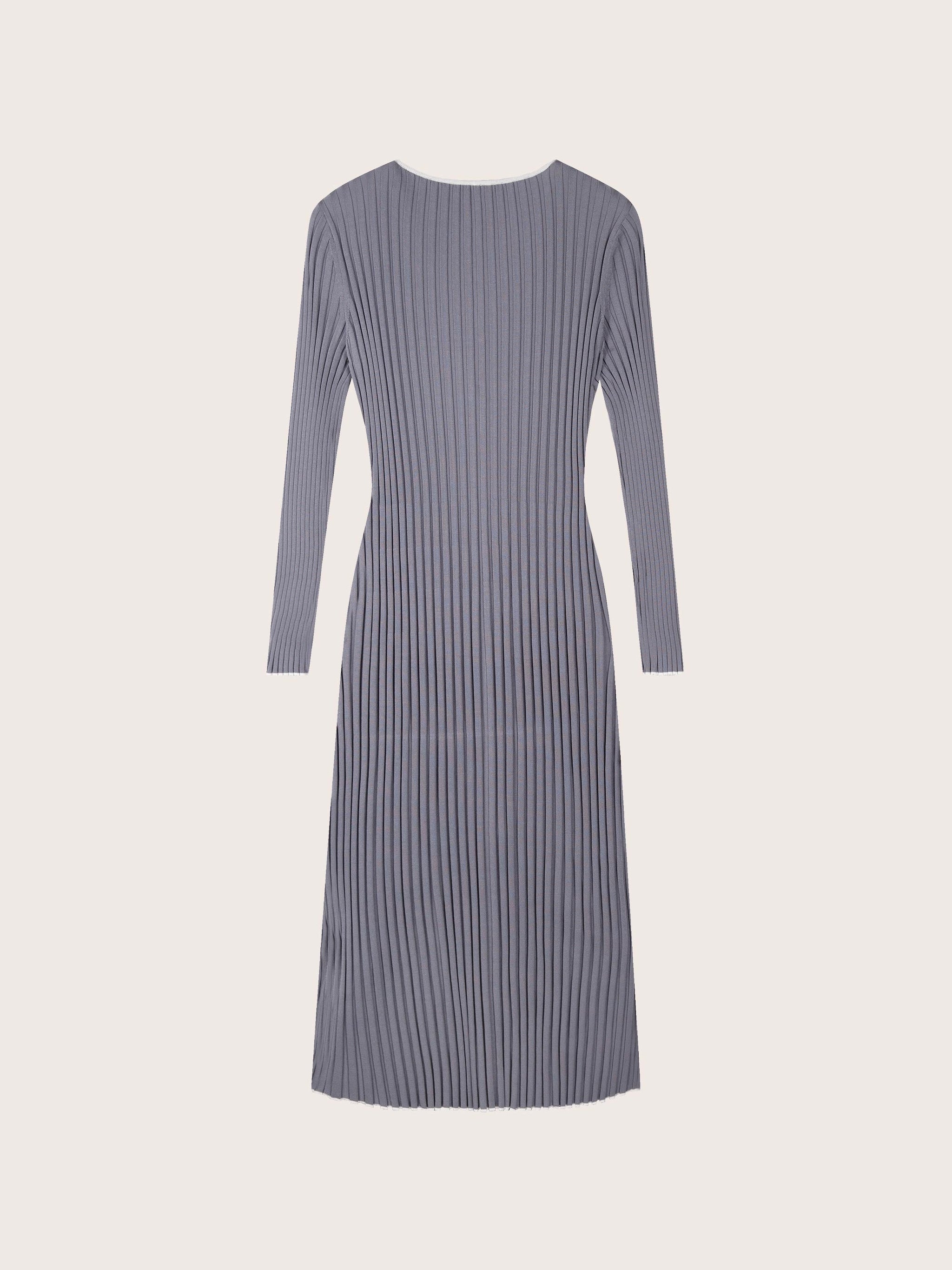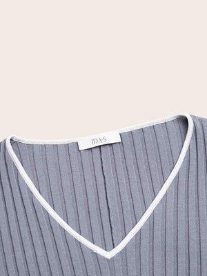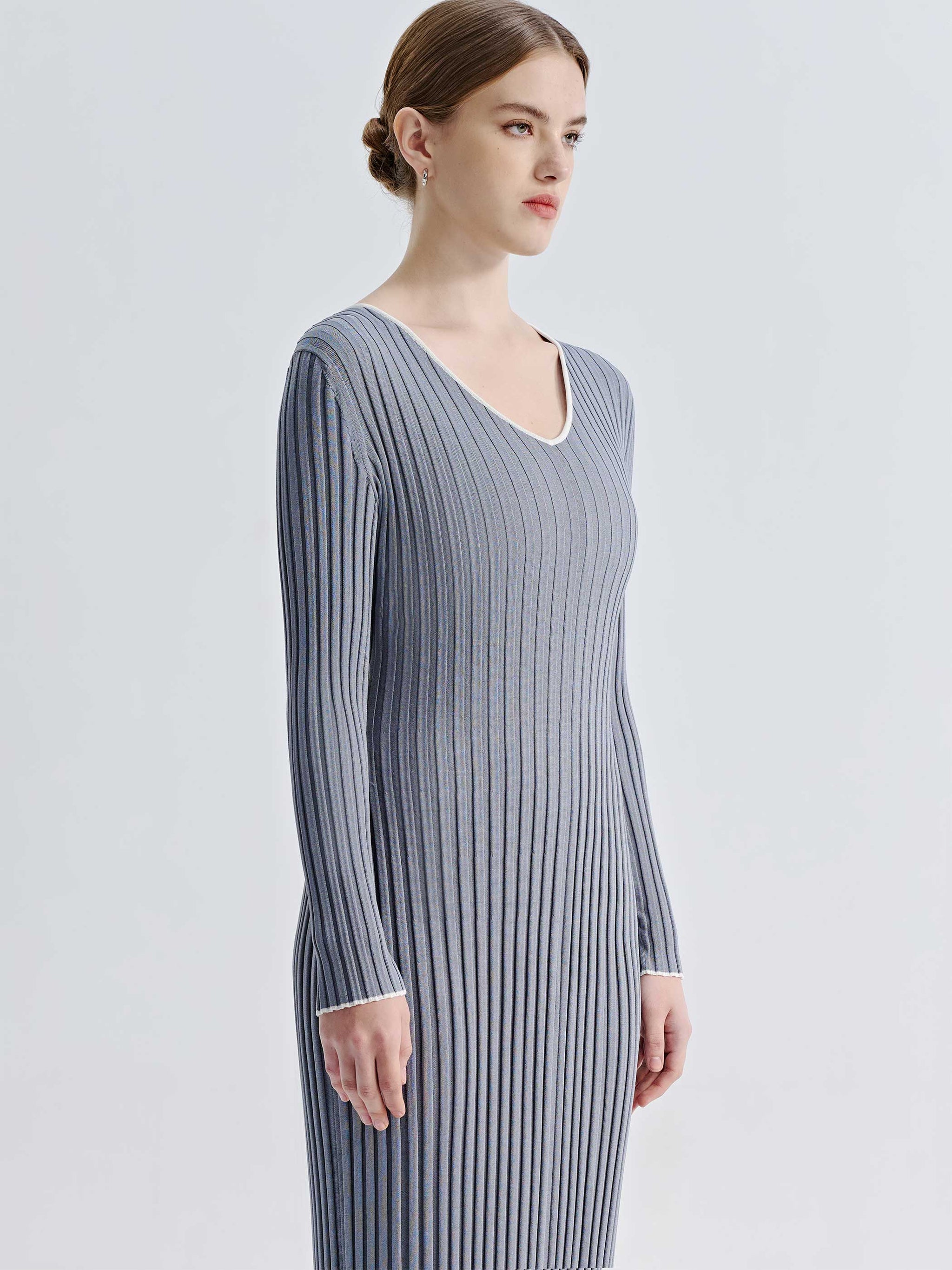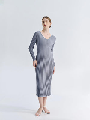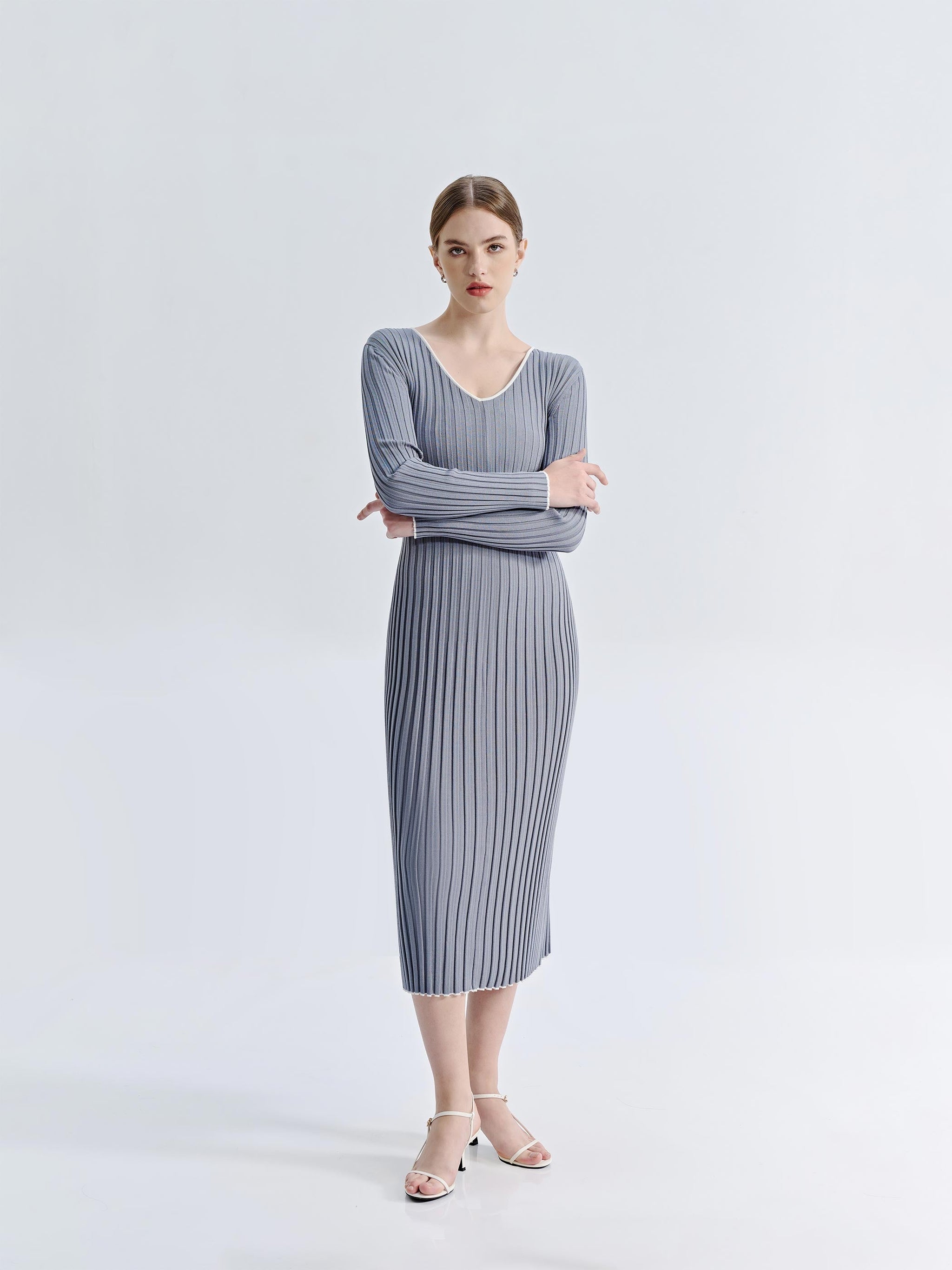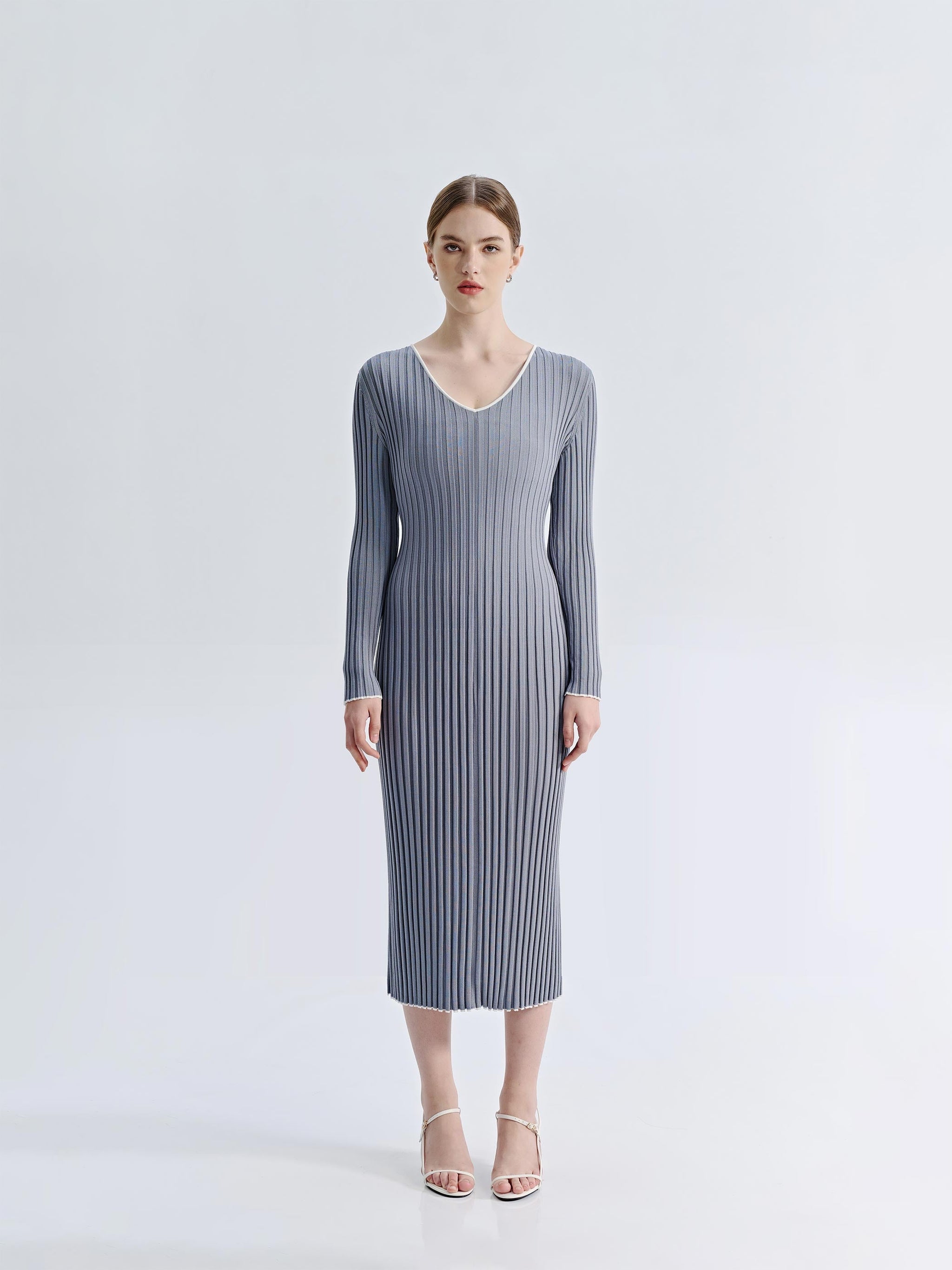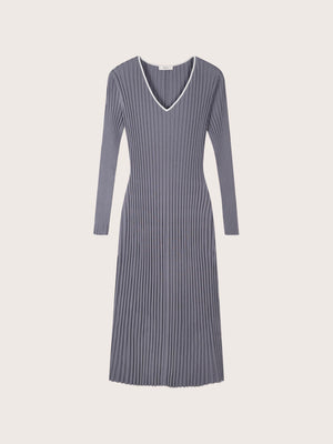 The Asha V-Neck Knit Dress features a flattering, form-hugging ribbed knit that enhances natural curves. White trim along the V-neckline, wrists, and hem adds contrast and subtle detail. With its midi-length silhouette, this dress effortlessly balances sophistication and versatility for both casual and elevated styling.