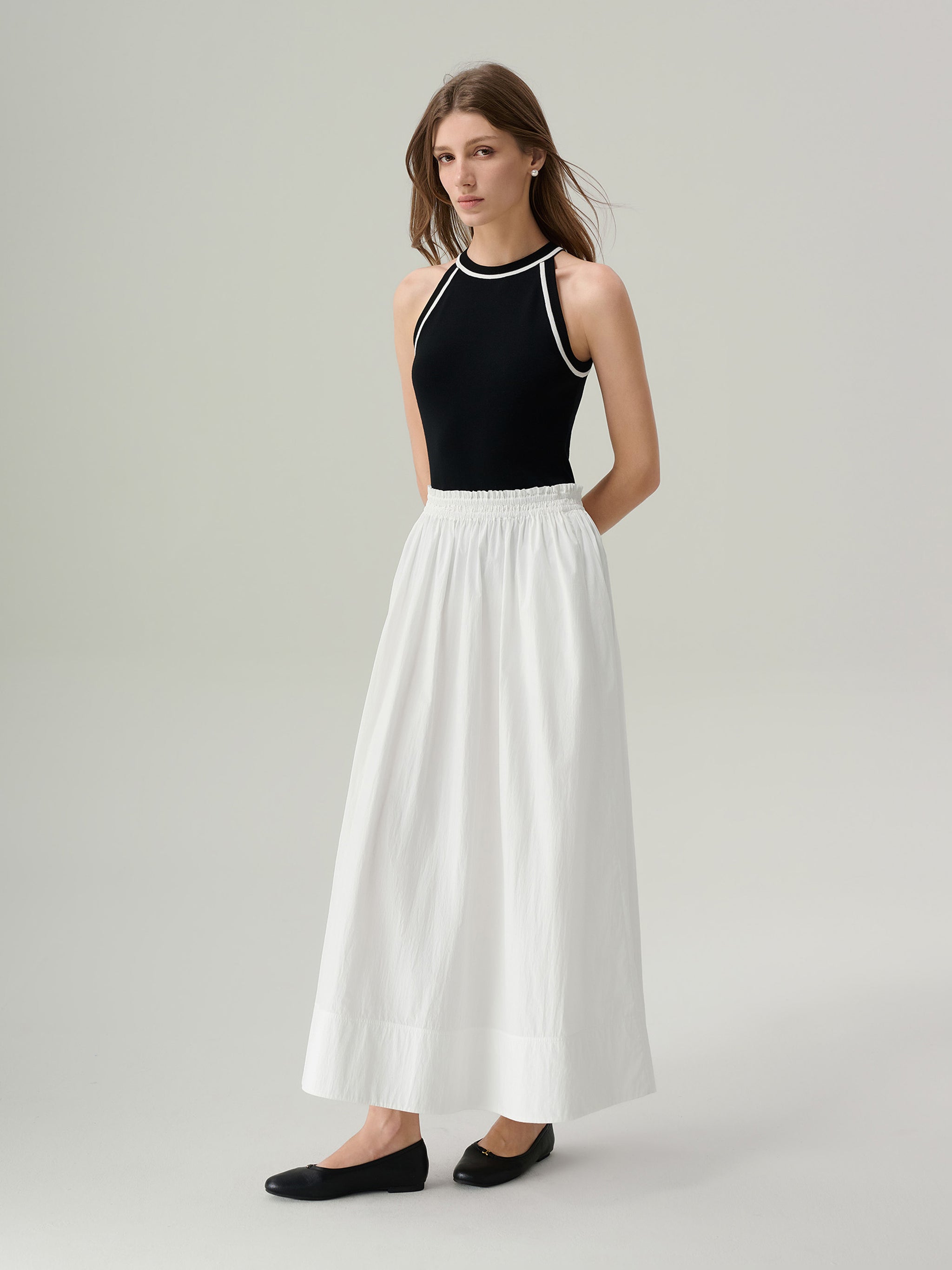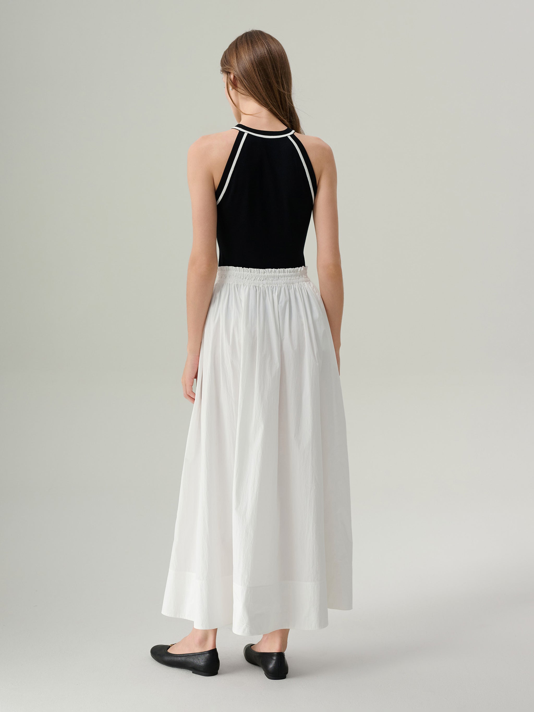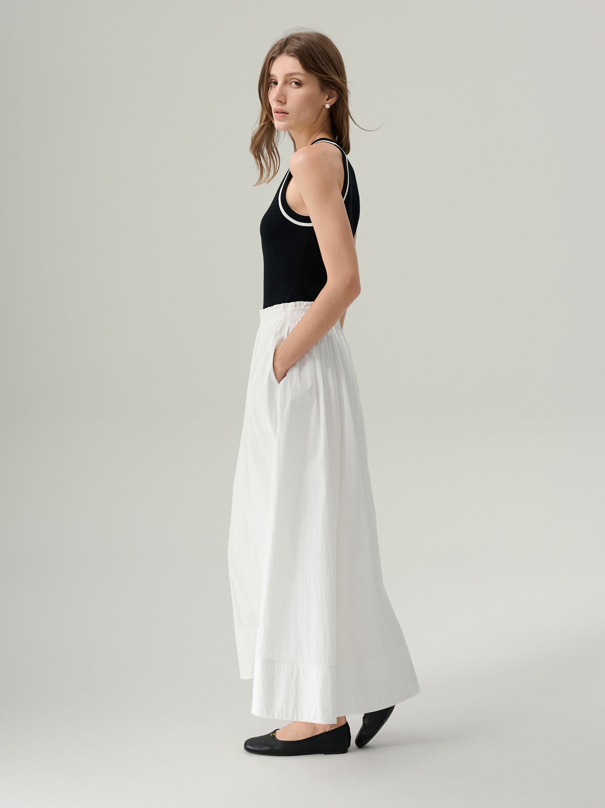 The Effie Cotton Midi Skirt is crafted from crisp white cotton, offering an airy, lightweight feel perfect for warm days. A smocked elastic waistband provides a comfortable, flexible fit, while subtle gathers create soft volume and movement through the A-line silhouette. Side pockets keep essentials close, and a wide hem panel lends a clean, structured finish.