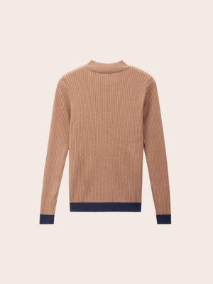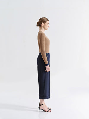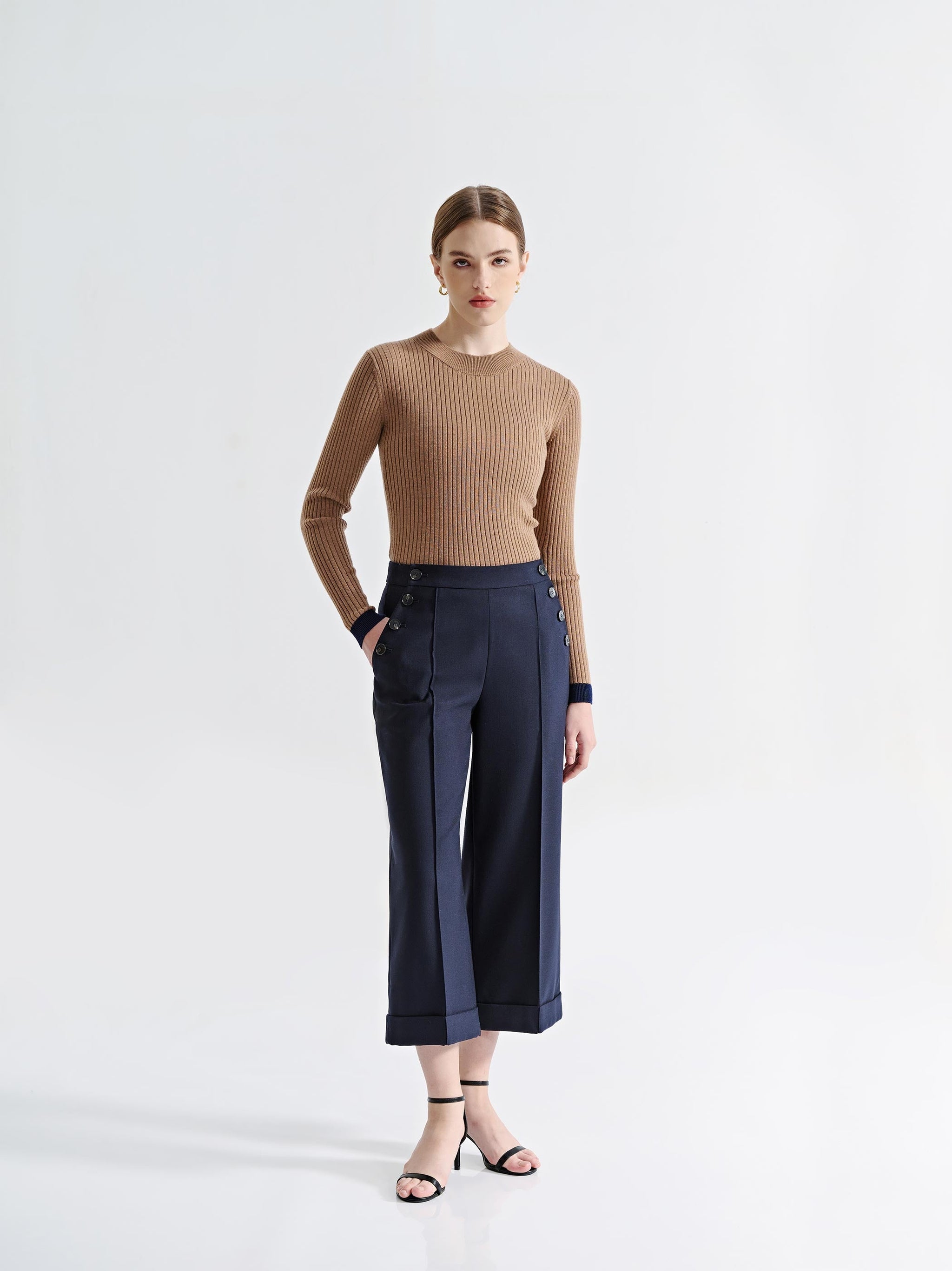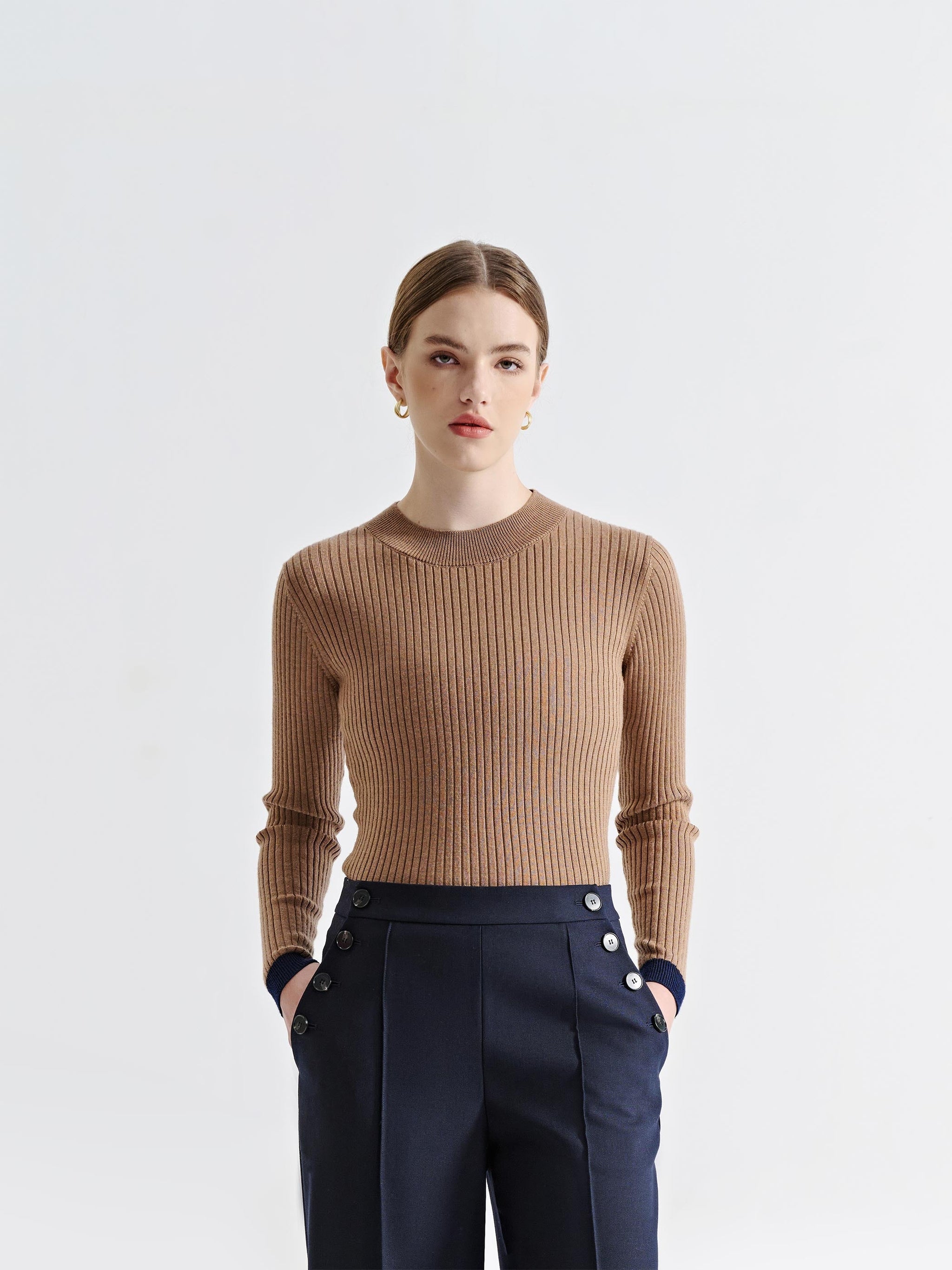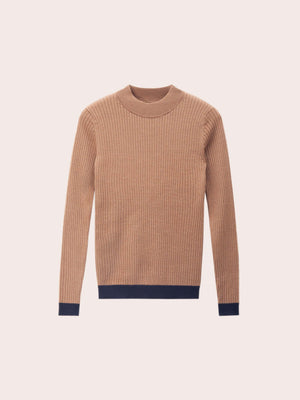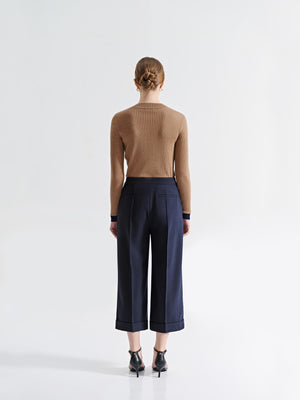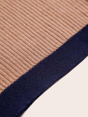 Blending softness and structure, the Evelyn Wool Silk Pullover Knit offers a slim, ribbed silhouette that fits snugly, making it ideal for layering under blazers, coats, or knitwear. The contrast navy color-block detailing at the cuffs and hem adds a modern touch, elevating this refined essential for both casual and professional settings.