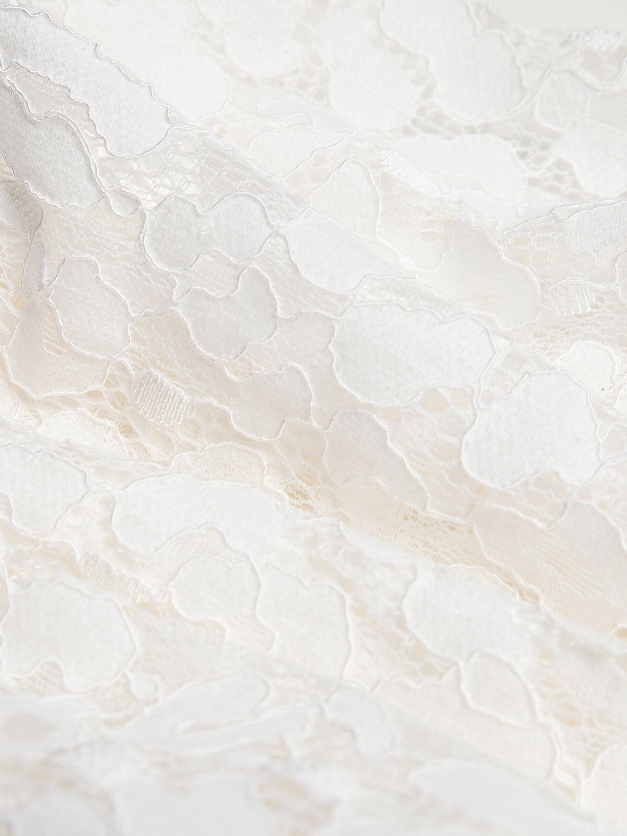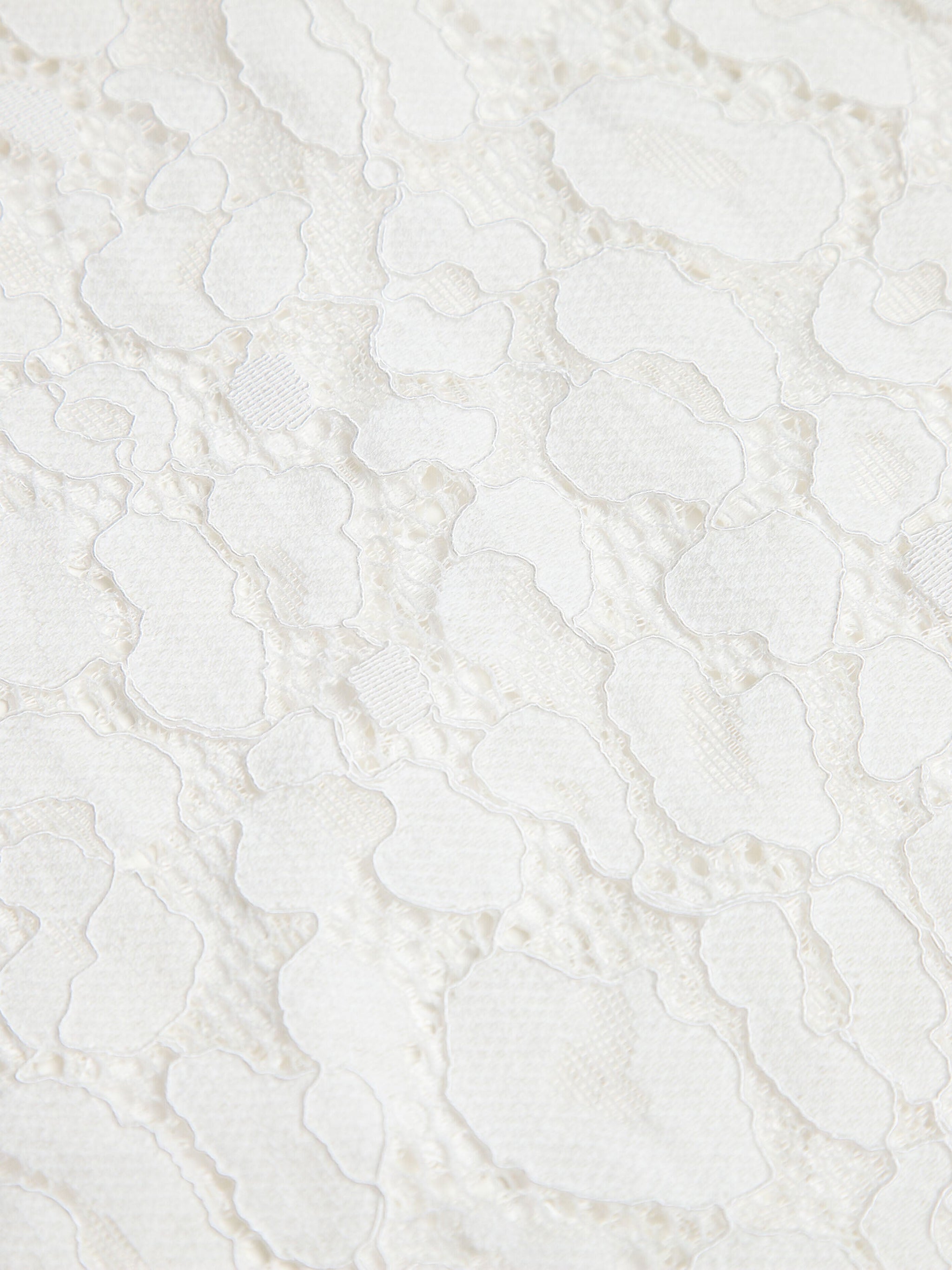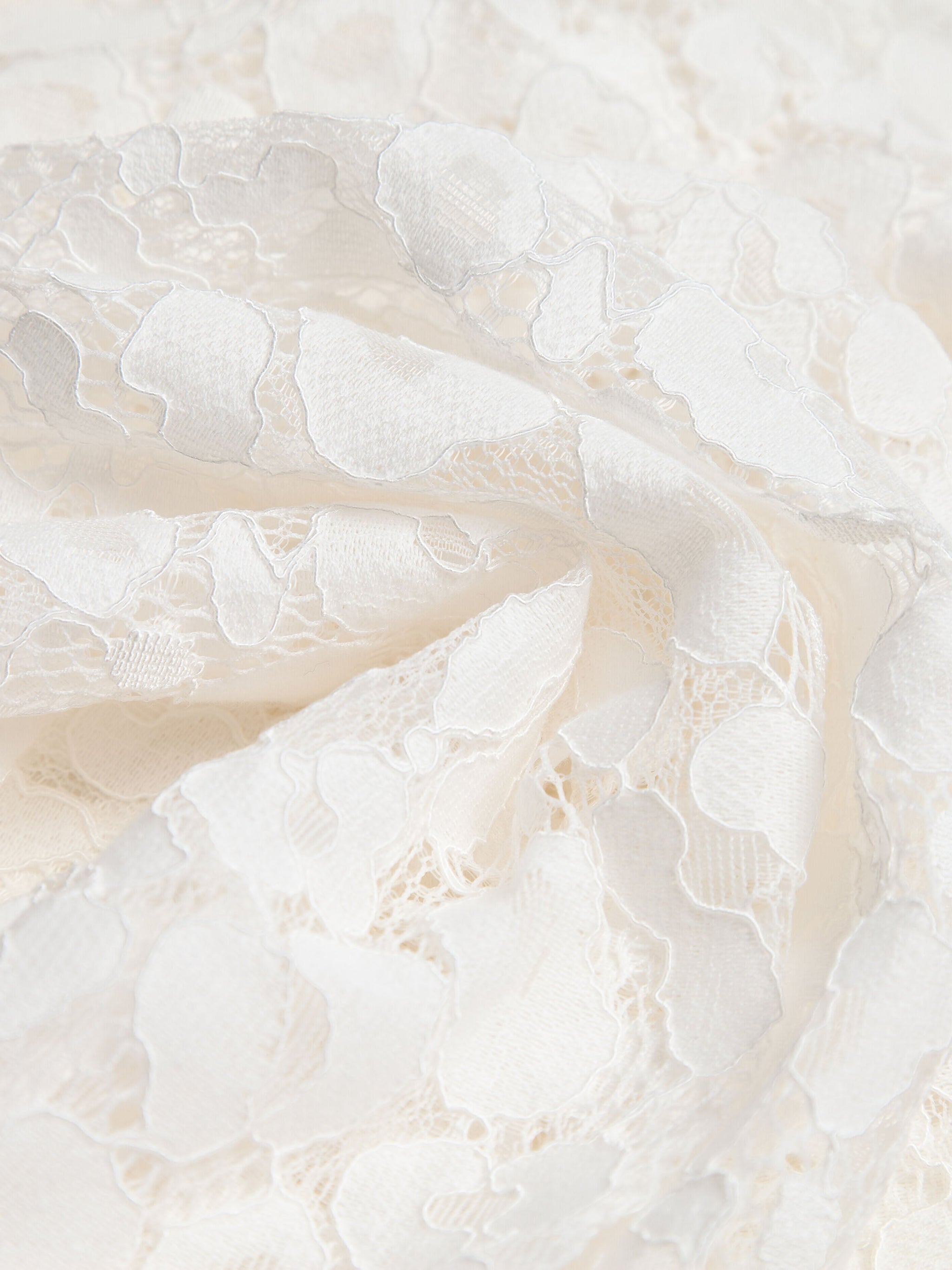 Delicate yet strong, this fabric blends nylon with combed cotton to create lace that is both durable and luxuriously soft against the skin. Raised three-dimensional motifs rest on a fine hexagonal mesh, offering airy transparency that catches and reflects light beautifully.