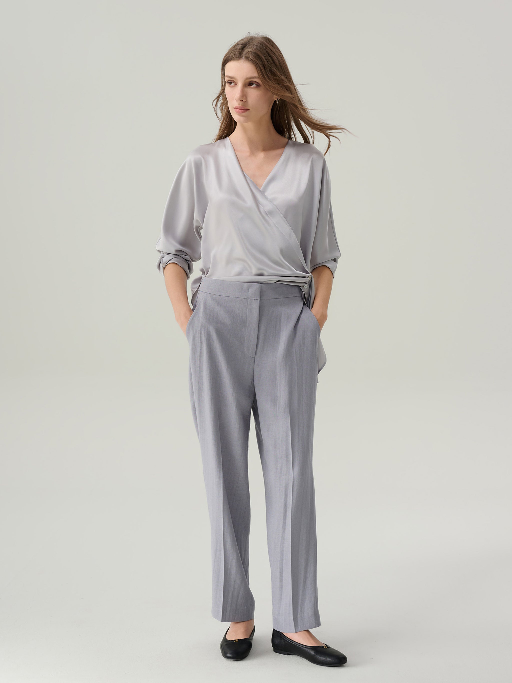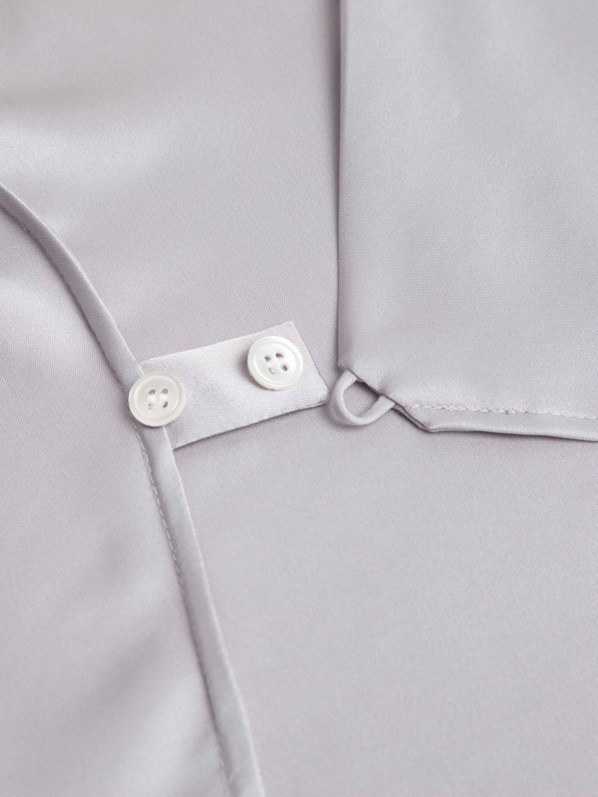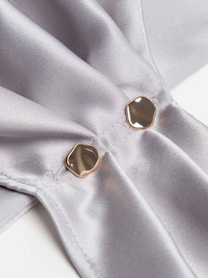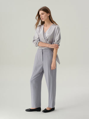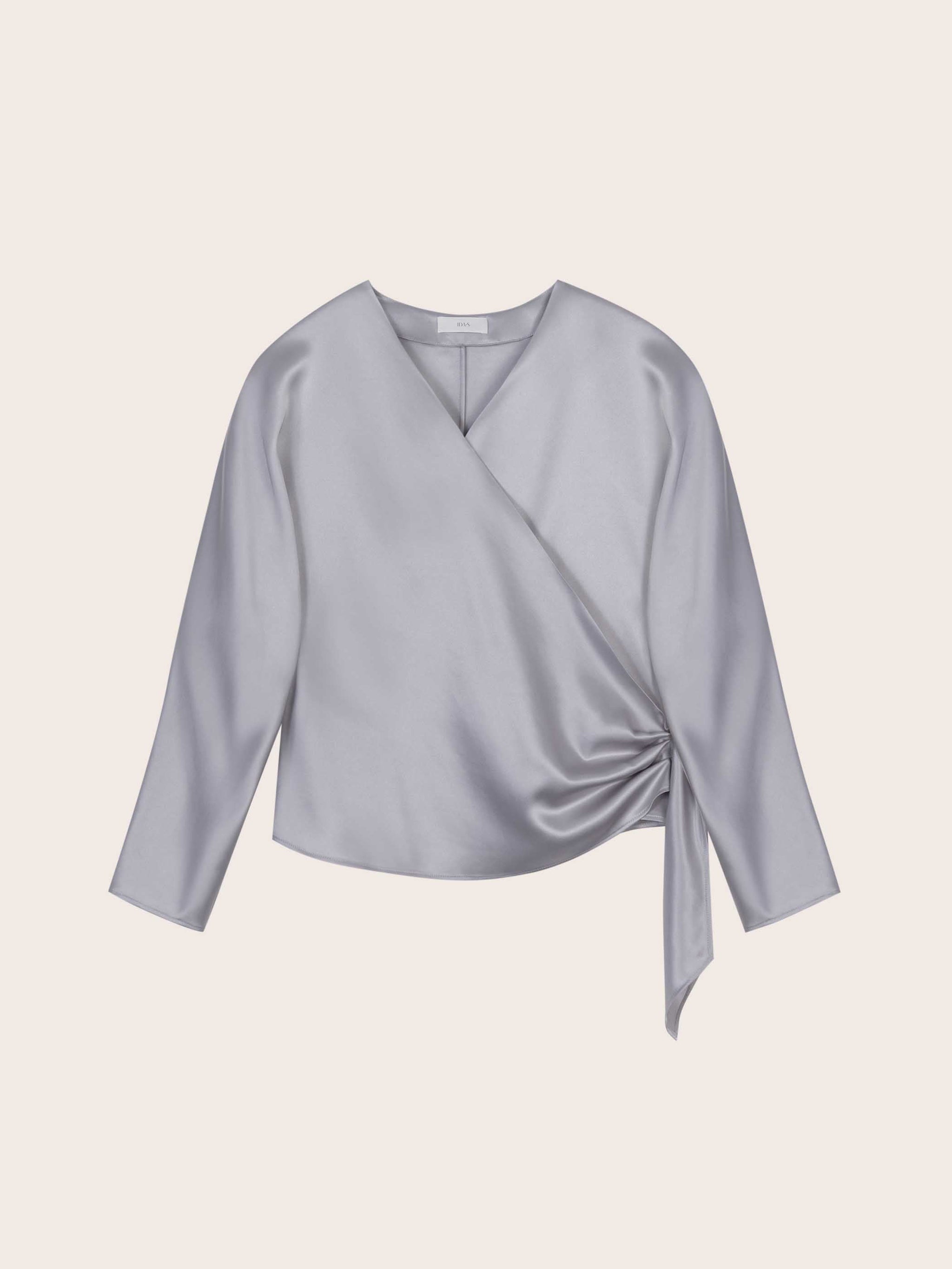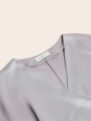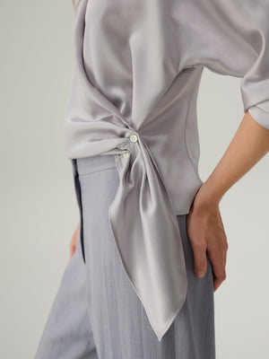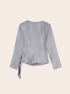 Refined and fluid, the Juliette Satin Wrap Blouse is cut from lustrous pale grey satin that drapes effortlessly over the frame. Designed with a flattering V-neckline and adjustable side tie, it’s finished with hammered metallic buttons. Equally suited for day or evening, it pairs seamlessly with both tailored trousers and flowing skirts.
